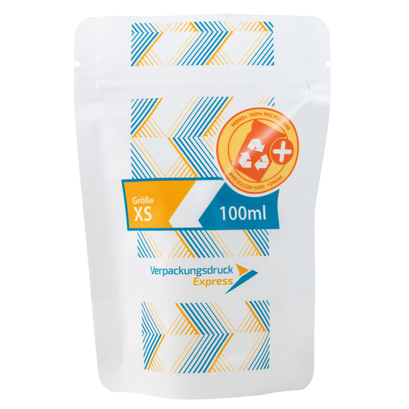 Die Standbodenbeutel bestehen aus einer weißer PE-Monofolie, die ab der Stückzahl 10 zu attraktiven Preisen, mit Ihrem Design hochwertig bedruckt werden. Durch die Verwendung eines einzigen Materials können die Beutel zu 100% recycelt werden.